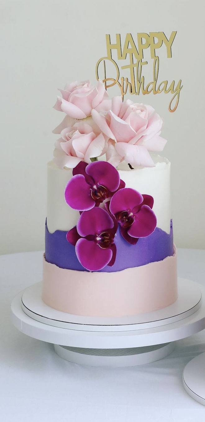 ۵ کیلو باشد و مطابق عکس رنگبندی شود. با گلهای طبیعی طبق عکس تزیین شود. برای بله برون هست اگر به جای Happy Birthday بتونید she said yes بزارید ممنونم میشم. خامه کشی شود و فوندانت نباشد. با پیک ارسال کنید .ممنونم