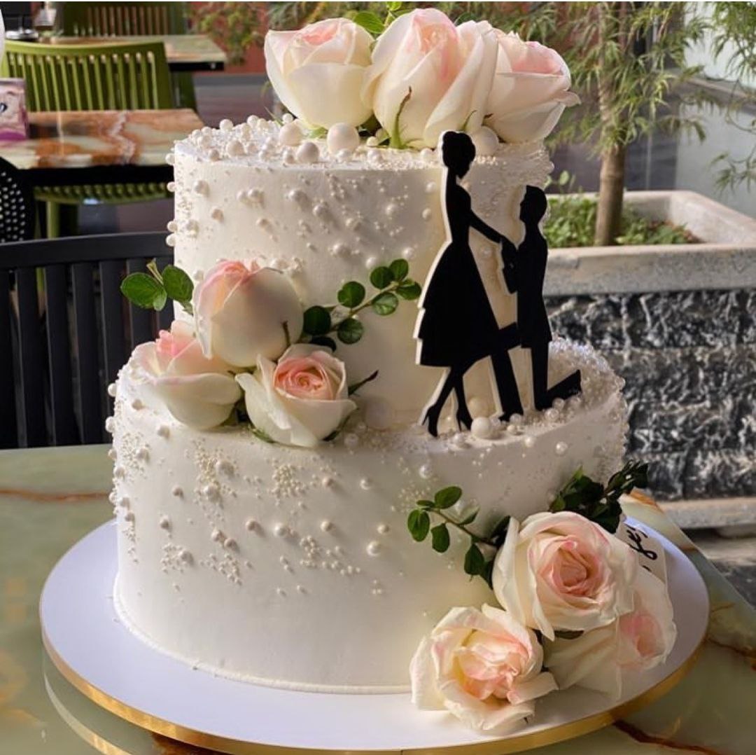 وزن ۶ کیلو دو طبقه، شبیه به عکس ذیل و بجای عروسک عروس و داماد به بدنه کیک متن درج گردد. در صورت امکان لایه فوندات رویی نازک باشد