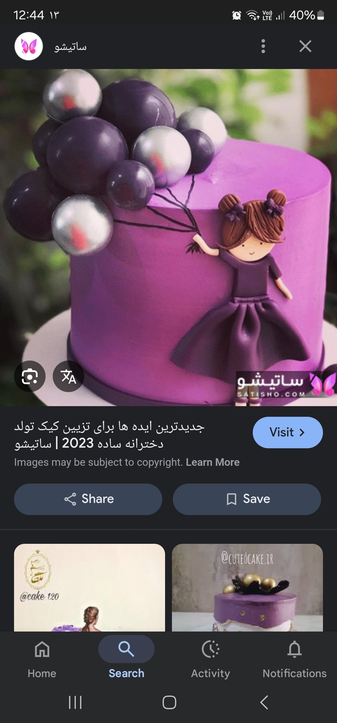 کیک ۲.۵ کیلویی خامه ای بنفش عروسک و بادکنکهای بنفش و سفید فوندانت