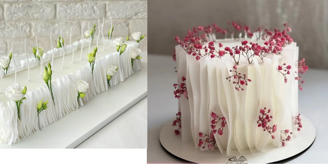 کیک مستطیل یک طبقه سه کیلویی با تزیین ویفر پیپر و گل صورتی که در عکس سمت راست هست. کیک برای تولده واسه همین نمیخوایم شبیه کیک نامزدی (عکس سمت چپ) بشه